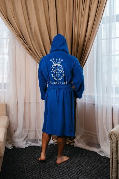 Халат махровый с капюшоном, васильковый с вышивкой
