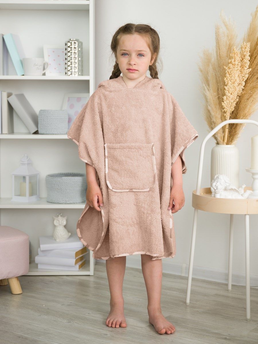 Пончо для детей станет интересной альтернативой банному полотенцу или домашнему халату после купания, для посещения сауны или бассейна. Капюшон с ушами мышки, вместительный фронтальный карман и контрастная бязевая отделка делают модель максимально удобной и ещё более стильной.