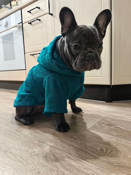 Материал: Натуральный хлопок (махровое полотно). Плотность 380-400 г/м² обеспечивает оптимальную впитываемость и воздухопроницаемость. Халат мягко согревает, не давая собаке замерзнуть, и при этом позволяет коже дышать.