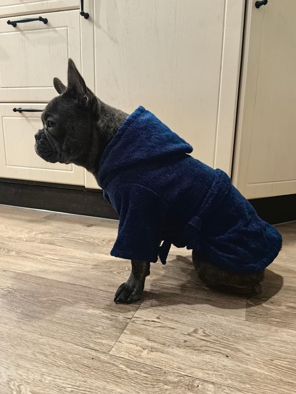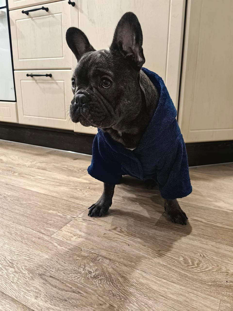 Материал: Натуральный хлопок (махровое полотно). Плотность 380-400 г/м² обеспечивает оптимальную впитываемость и воздухопроницаемость. Халат мягко согревает, не давая собаке замерзнуть, и при этом позволяет коже дышать.