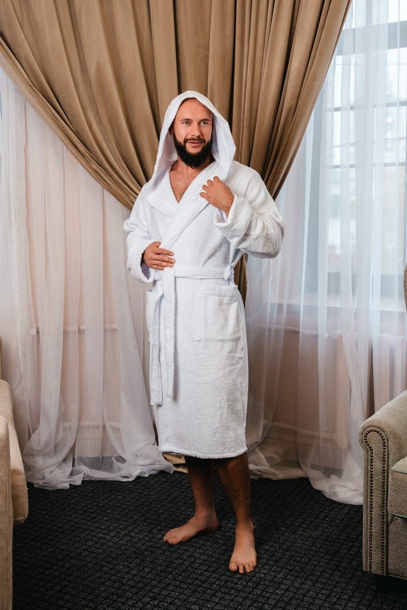 Модель халата с поясом позволяет ему быть универсальным и подходит к любому типу телосложения, скрывая недостатки и подчеркивая достоинства фигуры. Наличие карманов делает его практичным для ношения дома, в бане или сауне, а также на отдыхе.